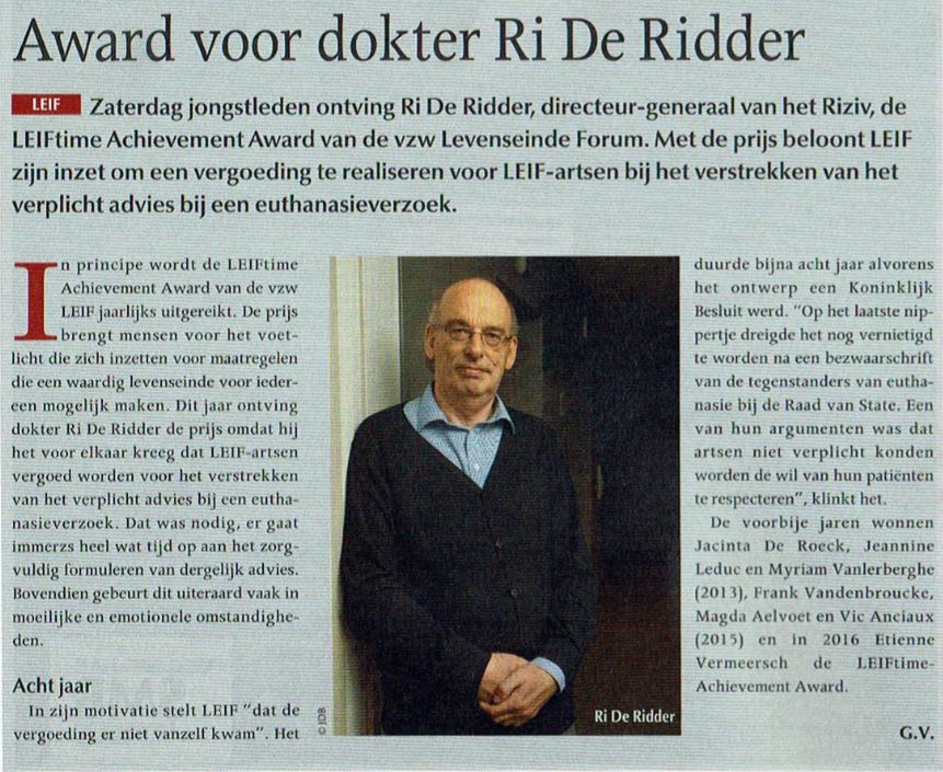 Dit jaar gaat de prijs naar Dr Ri De Ridder, directeur-generaal van het RIZIV. De prijs werd hem nu uitgereikt omdat hij normaal in oktober 2017 zou gepensioneerd zijn en LEIF elke perceptie van streven naar favoritisme wilt vermijden. Intussen blijkt zijn aanstelling te zijn verlengd.