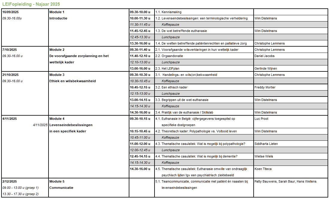 Verpleegkundigen en andere zorgverleners (psychologen, maatschappelijk werkers, moreel consulenten, pastores, kinesisten,…) hebben behoefte aan opleiding over de beslissingen bij het levenseinde.