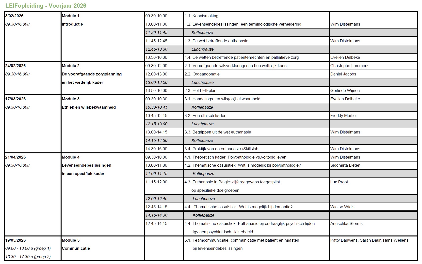 De opleiding bestaat uit 5 modules (modules 1-4 van 9u30 tot 16 uur, module 5 een voo- of namiddag) die zowel in het na- als het voorjaar georganiseerd worden.