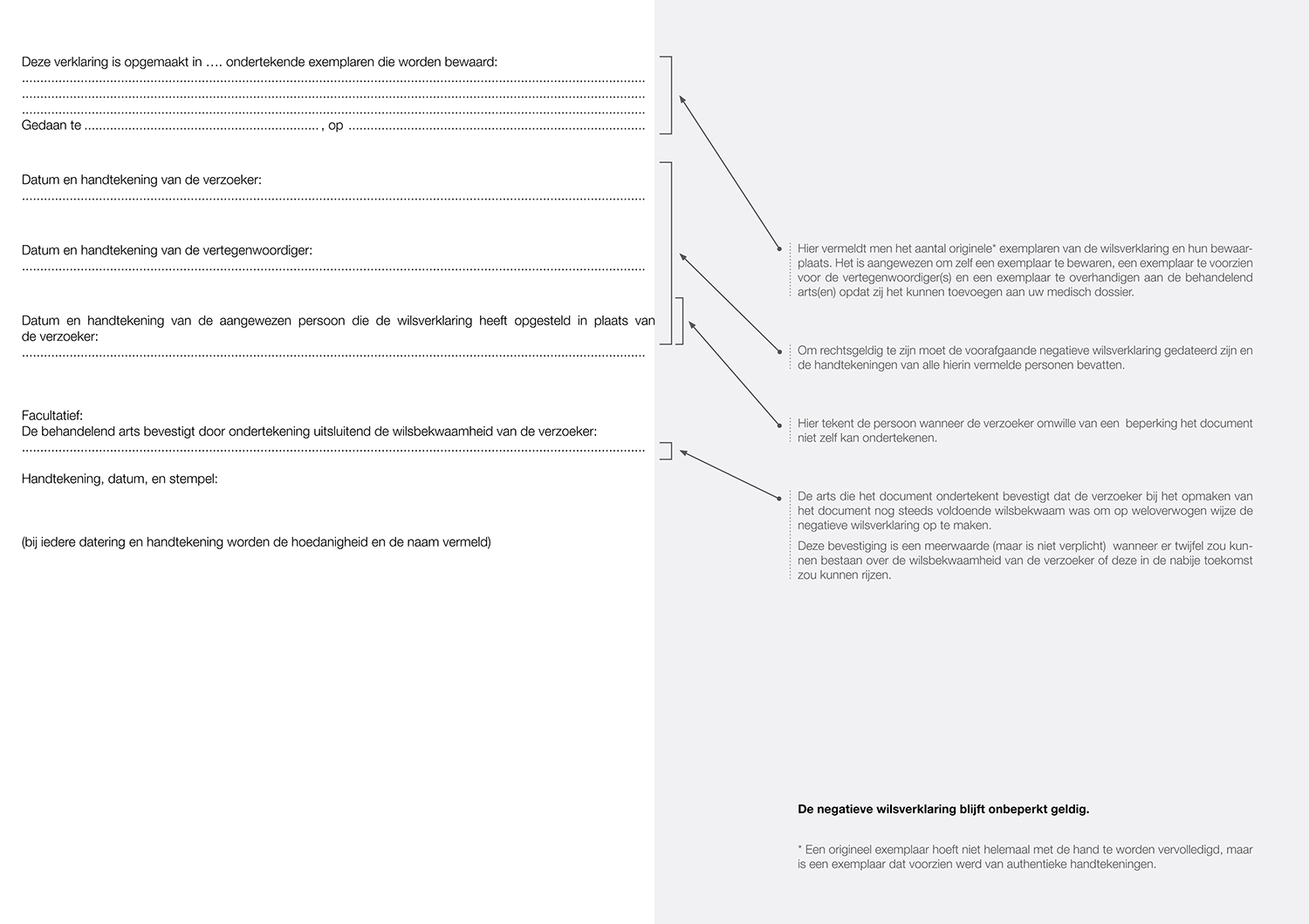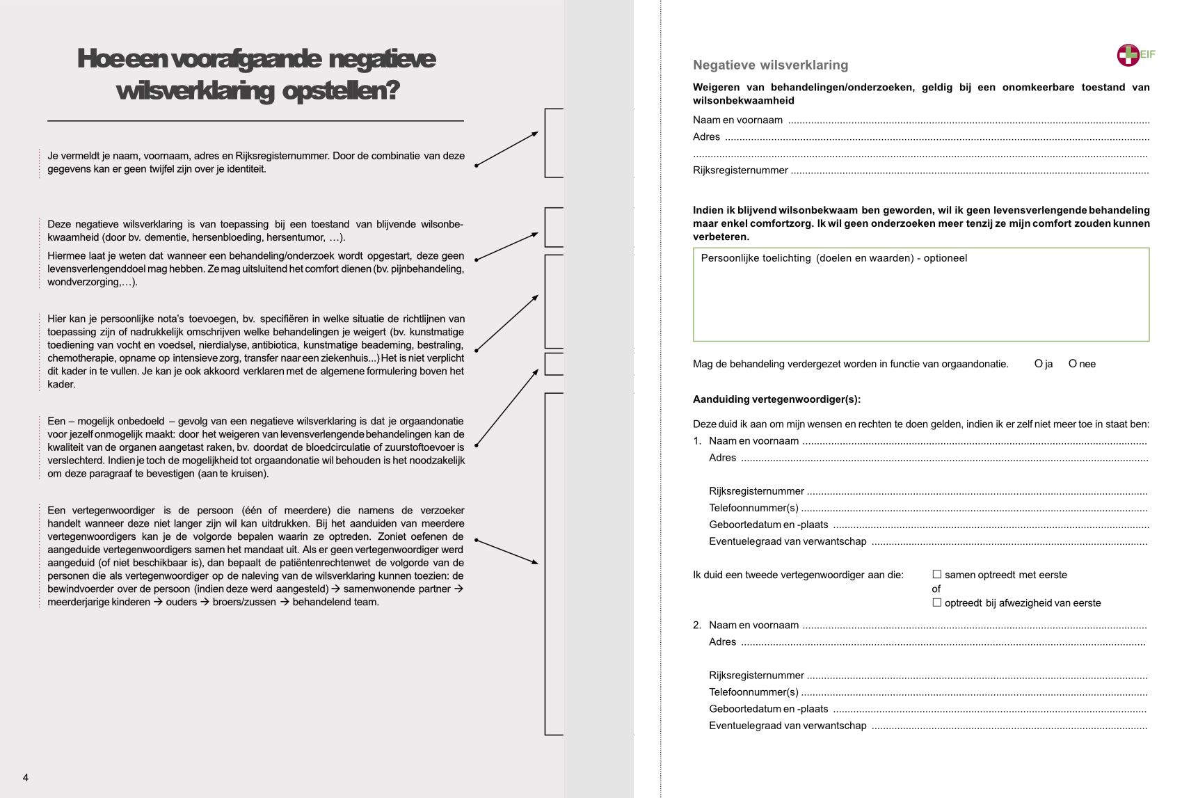 Maar de meeste mensen willen die inspraak ook houden in situaties waarin ze niet langer wilsbekwaam zouden zijn. De manier om hieraan tegemoet te komen is door een voorafgaande “negatieve” wilsverklaring op te stellen.