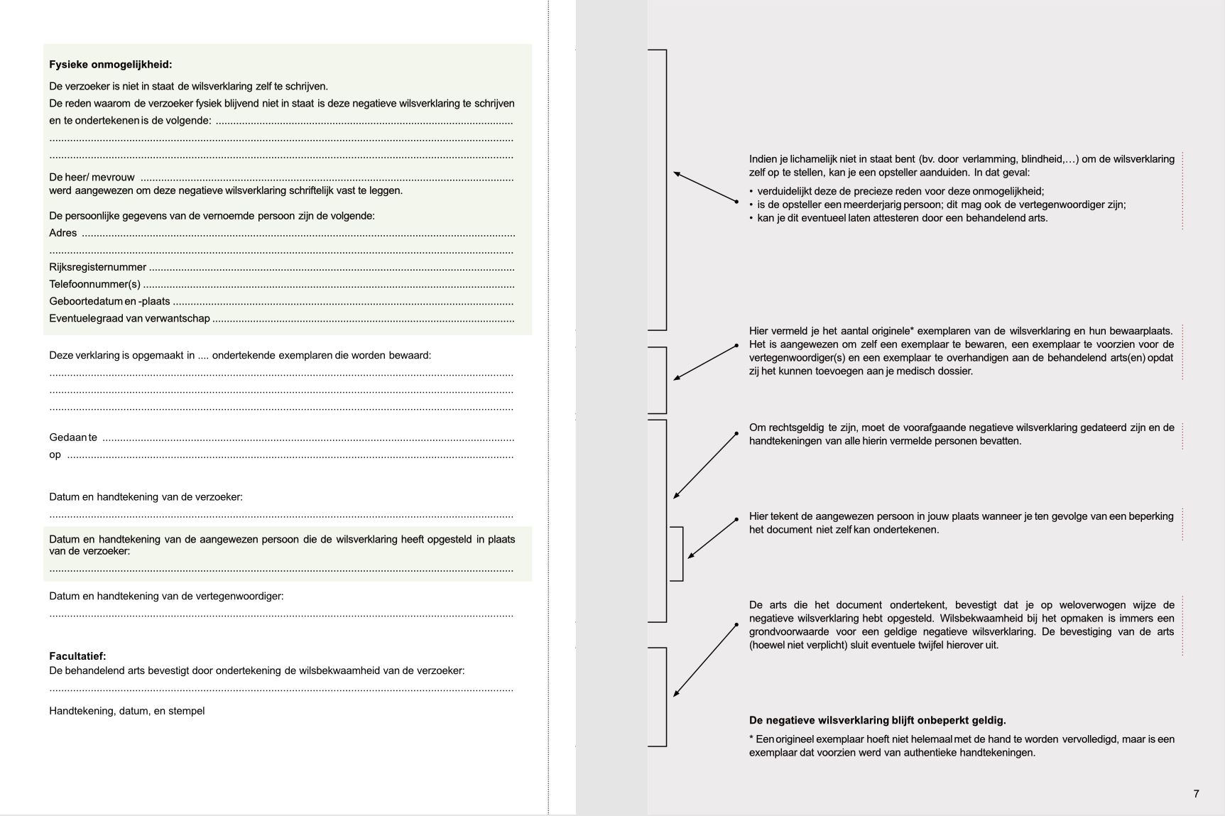 Met dit document kan je vastleggen welke onderzoeken of behandelingen je niet meer wenst wanneer je op dat moment zelf de beslissing niet meer zou kunnen nemen als gevolg van wilsonbekwaamheid (zoals bij coma, dementie, verwardheid of hersentumor, …)